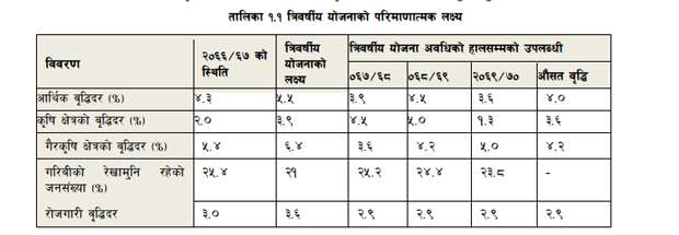 विगतमा पनि त्रिवर्षीय योजनावधिमा महत्वाकांक्षी लक्ष नलिइउको होइन । तर, परिणाम भने ऋणात्मक हुन पुग्यो । जस्तो ०६६/०६७ मा ४.३ प्रतिशत रहेको आर्थिक वृद्धिदर ०६९/०७० मा ३.६ प्रतिशतमा झरेको छ । कृषि क्षेत्रको आर्थिक वृद्धिदर ०६८/०६९ मा ५ प्रतिशत पुगेकोमा ०६९/०७० मा ३.६ मा झरेको छ । आयोगले आफ्नो प्रस्तावित आधारपत्रको मस्यौदामा भनेको छ-’अनुकूल मौसम र अन्य कारण अपेक्षित लक्ष्य हासिल भए पनि अन्तिम वर्ष देखिएको रासायनिक मलको अभाव, मौसमको प्रतिकूलता र समयमै पूर्ण वजेट आउन नसक्नु एवं गैरकृषि क्षेत्रतर्फ वित्तीय मध्यस्थता, उद्योग तथा खानी, विद्युत, ग्यास र पानीको वृद्धिदर न्यून र निर्माण क्षेत्रमा भएको ऋणात्मक वृद्धिले लक्ष्य हासिल हुन सकेन ।’