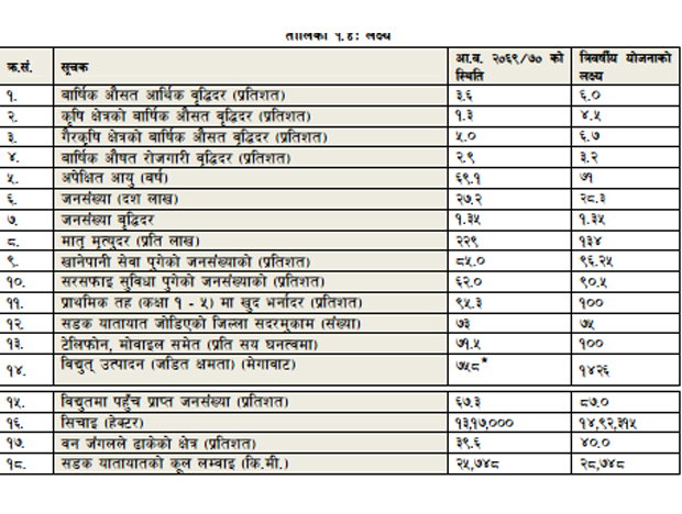 -नेपालमा टेलीफोन र मोवाइल प्रति १ सय घनत्वमा ७१.५ प्रतिशत प्रयोगमा आइरहेकोमा ३ वर्षपछि सत प्रतिशत पुग्ने आयोगको आधारपत्रमा उल्लेख छ । त्यस्तै ९५.३ प्रतिशतमा रहेको प्राथमिक तहको विद्यार्थी भर्नादरलाई पनि सत प्रतिशत पुर्याइने लक्ष लिइएको छ ।