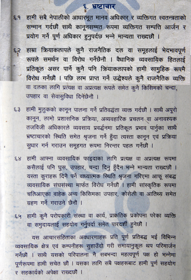 आचार संहिताको ६ नम्बर दफाले पछि लाभ प्राप्त गर्ने उद्देश्यले चन्दा नदिने भनिसकेपछि राजनीतिक लाभको पदमा उद्योगीहरु सहभागी हुनु आचारसंहिता विपरीत ठहरिने भएको छ । विगतमा भने विभिन्न दललाई भारी रकम चन्दा दिएर उद्योगपतिहरु सभासद भनेका थिए । अहिले राजनीतिक दललाई समर्थन वा विरोध नगर्ने बताउने एनबीआइका अध्यक्ष पद्म ज्योति पनि विगत संविधानसभामा माओवादीबाट सभासद बन्नुभएको थियो ।