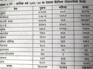 सरकारी तथ्यांक अनुसार पछिल्लो आर्थिक वर्षमा २ लाख ७६ हजार ७ सय ८७ जना नेपाली रोजगारीका लागि विदेशिएका छन् । यी मध्ये १६ हजार महिला छन् भने बाँकी २ लाख ६० हजार ७४ जना पुरुष रहेका छन् ।