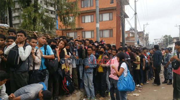 ६ भदौ, काठमाडौं । कोरियन भाषा परीक्षाको आवेदन भर्ने व्यक्तिहरुको चाप अत्यधिक भएपछि प्रहरीलाई लाइन व्यवस्थापन गर्न आज बिहीबार झन समस्या भएको छ । प्रहरीले बीचमा घुसपैठ रोक्न प्रयास गरेको जनाए पनि पछि आएका व्यक्ति अगाडि घुसेको र आफूहरु कुरेको कुरै भएको भन्दै युवाहरुले आक्रोश पोखिरहेका छन् ।