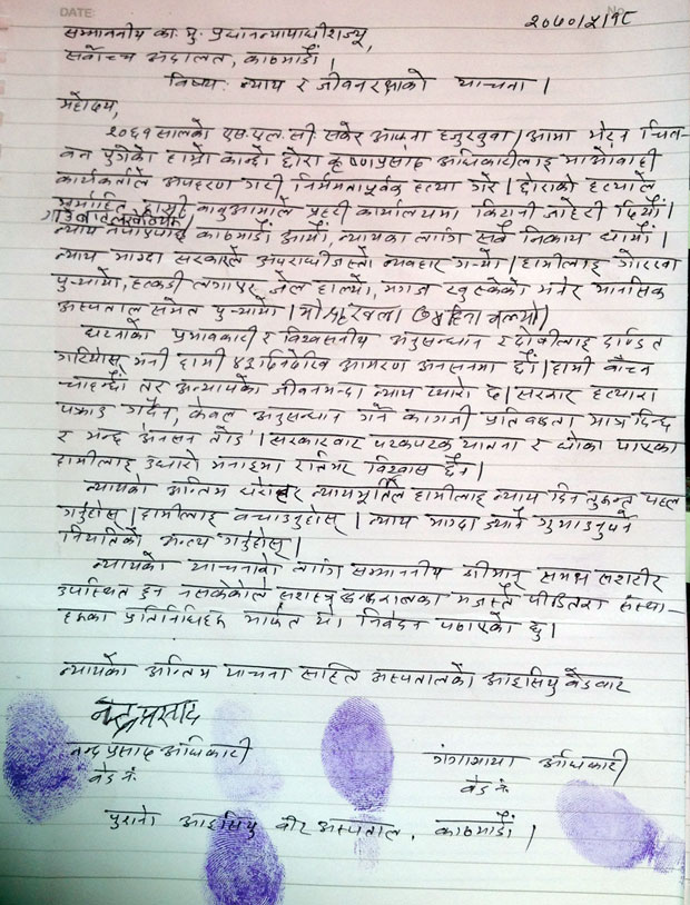 १८ भदौ, काठमाडौं । वीर अस्पतालको शैय्यामा ४३ दिनदेखि आमरण अनशनमा रहेका नन्दप्रसाद अधिकारी र गंगामाया अधिकारीलाई सरकारले जबर्जस्ती खाना खुवाउने (फोर्स फिडिङ)को तयारी थालेको छ । यता सर्वोच्च अदालतले आजै एक रिट उपर सुनुवाइ गर्दै अधिकारीका छोरा कृष्णप्रसादको हत्याको छानविन कार्य कहाँ पुगेको छ भन्नेबारे श्वेतपत्र जारी गर्न आदेश दिएको छ । अनशनमा बसेका अधिकारी दम्पतीले आजै कायममुकायम प्रधानन्यायाधीश दामोदरप्रसाद शर्मासमक्ष न्याय र जीवनरक्षाका लागि पत्र लेखेका छन् । अधिकारी दम्पत्तिका तर्फबाट लेखिएको पत्र सरोकारवालाहरुले शर्माको सचिवालयलाई बुझाएका हुन् ।